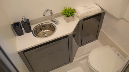 À bord du Schaefer V33 STELLAR, découvrez une cabine spacieuse équipée d'une douche et de toilettes, vous offrant un espace privé pour un confort et une commodité absolus. L'espace extérieur est modulable pour vous offrir une protection solaire totale ou partielle selon vos envies.